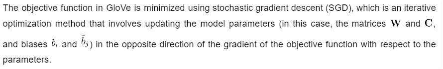This process is repeated until the objective function has converged to a minimum or a preset number of iterations has been reached. The process of selecting mini-batches and updating the parameters is often referred to as an epoch. SGD is an efficient method for minimizing the objective function in GloVe because it does not require computing the Hessian matrix, which is the matrix of second-order partial derivatives of the objective function.